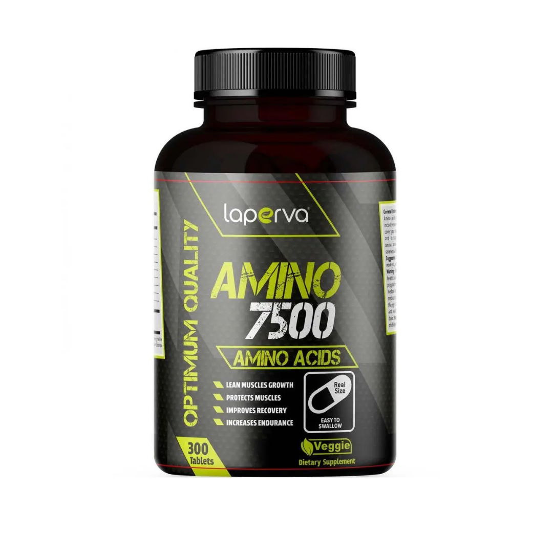 Laperva Amino 7500mg is a dietary supplement containing 7500 mg of essential amino acids per 300 tablet serving. The product is designed to support muscle growth, recovery, and endurance for physically active individuals and athletes. It contains a complex of amino acids including leucine, isoleucine, valine, lysine, and arginine.