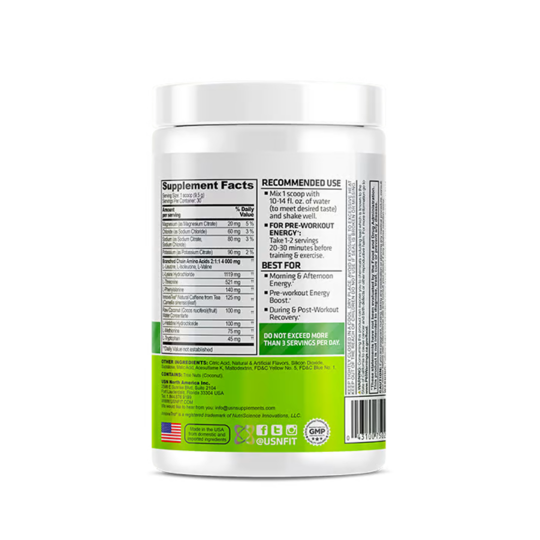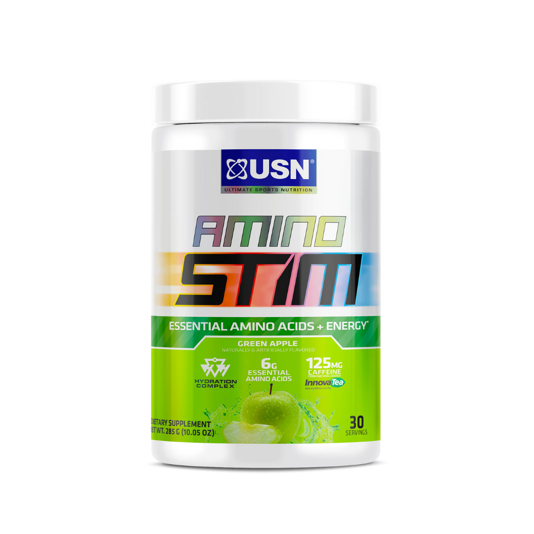 USN Amino Stim Green Apple is a sugar-free amino drink that contains TeaCrine and CarnoSyn to boost focus, recovery, and energy. It provides 125mg of natural caffeine from InnovaTea per serving, along with a hydration complex and essential amino acids to support muscle growth and recovery. The product is available in a 30-serving green apple flavor and is designed to enhance athletic performance and support muscle recovery.